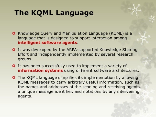 Knowledge query and manipulation language language protocol artificial intelligence kqml a language and protocol based on sgml for exchanging information and knowledge proposed in 1993. World Heritage Encyclopedia the aggregation of the largest online encyclopedias available and the most definitive collection ever assembled. Die KQML untersttzt die Netzwerkprogrammierung die im Rahmen der Agententechnologie fr wissenbasierte Systeme und.